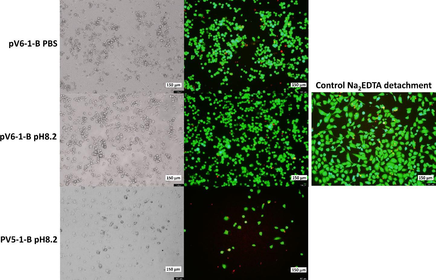 Fig.6. Life/Dead cell analysis after detachment and comparison with the control detachment via Na2EDTA. A549 were detached at high concentrations from the PV6-1-B polymer under temperature and pH change. Moreover, cell viability after detachment from the PV6-1-B polymer is high and similar to the Na2EDTA detachment. The number of cells detached from the PV5-1-B and PV5-2-B surfaces via stimuli were low although cells remained with metabolic activity (PV5-2-B has no significant difference from PV5-1-B).
