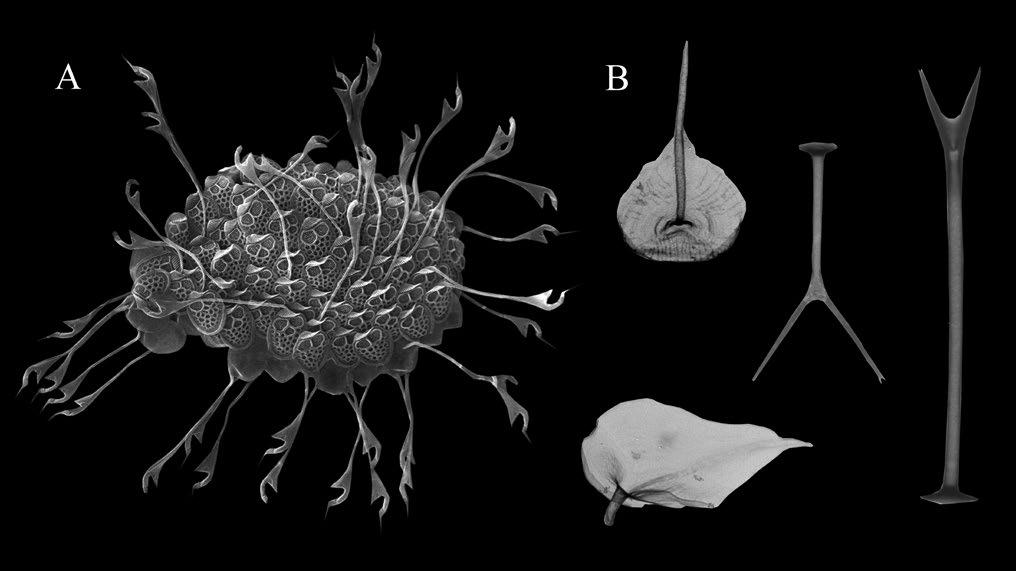 Fig.1. Scales of different silicon utilizing protists. A – a decayed cell of scaled chrysophytes; B – siliceous scales of centrochelid heliozoans.