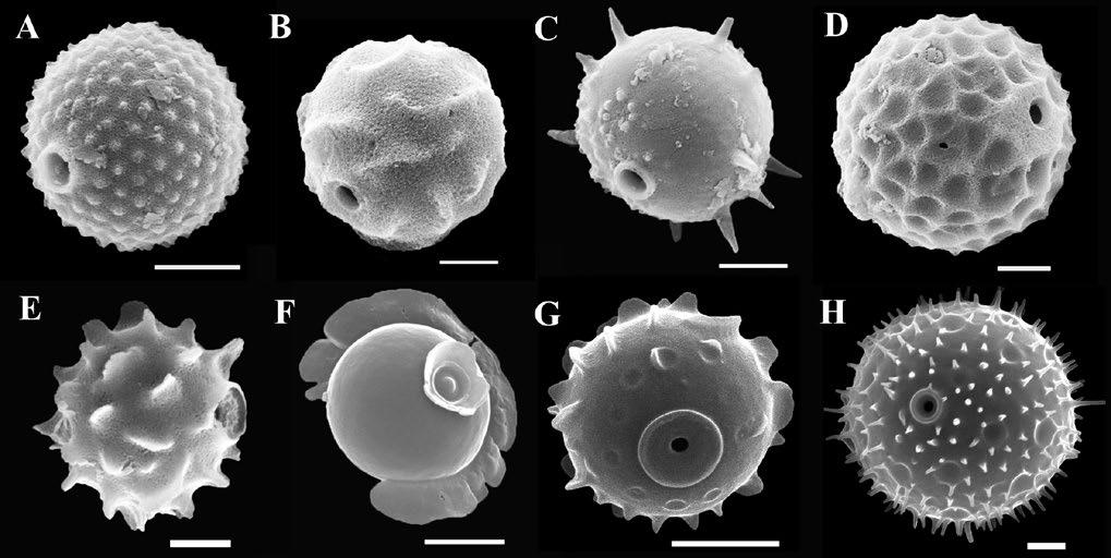 Fig.2. The variety of morphotypes of chrysophycean stomatocysts from Vorota Lake (Yakutia) (1-5) and Boguchany reservoir (6-8). A – Stomatocyst 031, Duff & Smol; B – Stomatocyst 498, Firsova & Bessudova; C – Stomatocyst 314, Firsova; D – Stomatocyst 506, Firsova & Bessudova; E – Stomatocyst 501, Firsova & Bessudova; F – Stomatocyst 489, Firsova & Bessudova; G – Stomatocyst 487; Firsova & Bessudova; H – Stomatocyst 076 Duff & Smol. Scale – 2 µm.