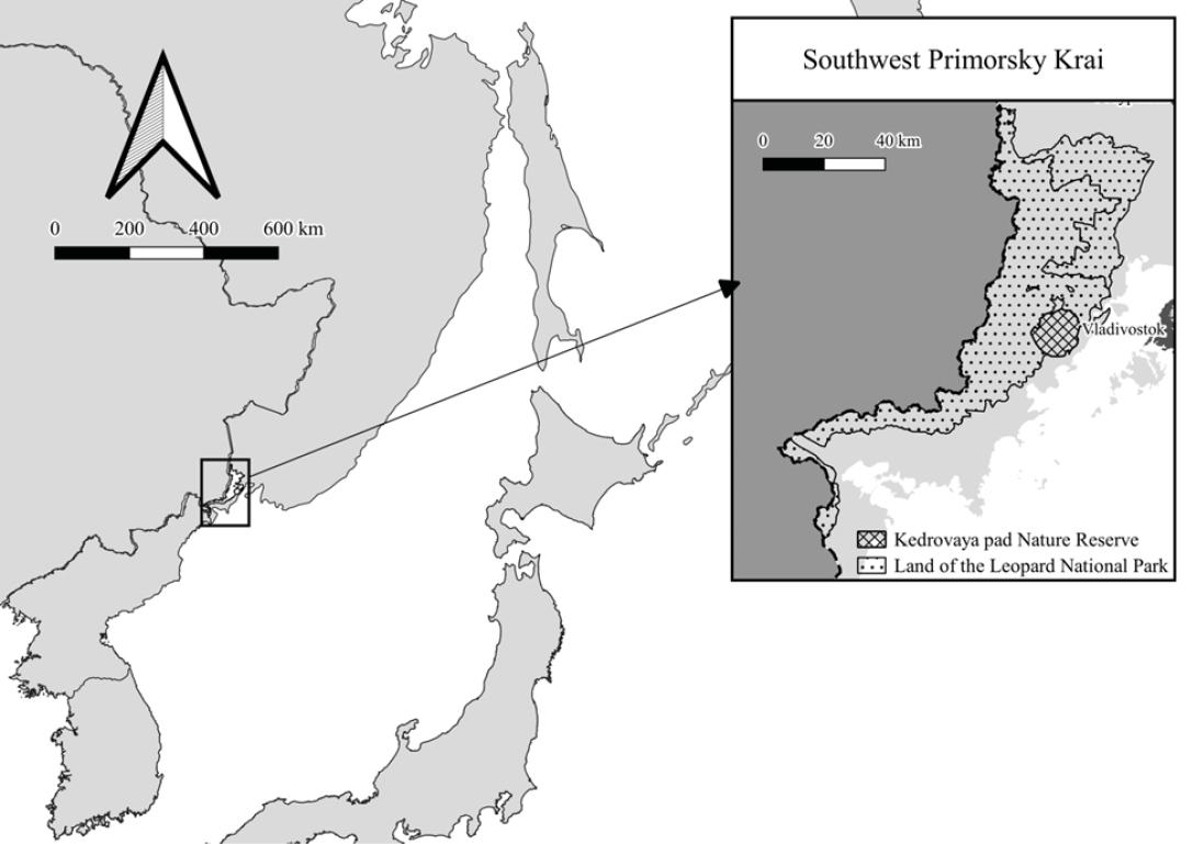 The material for the study was collected by the staff of the protected areas on the territory of the national park “Land of the Leopard” (Fig. 1). The fur of water deer was collected from animals found dead due to natural causes or as a result of poaching from 2010 to 2021.