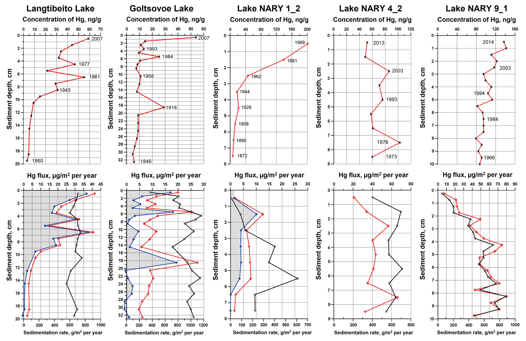 The concentration profiles of Hg in the bottom sediments themselves only indirectly reflected the nature of the metal entering the sediments and its source. The flows of elements in the sediments are more informational and complementary. The overall sedimentation rates (black curves in the figure) in all lakes, except for Langtibeito, gradually decrease to the surface layers, while Hg concentrations increase. The average mercury fluxes calculated from deposition rate, slice volume and weight, and mercury concentration in each layer (red curves) show gradual increases in the Langtibaito and Goltsovoe cores and decreases in all NARY cores.