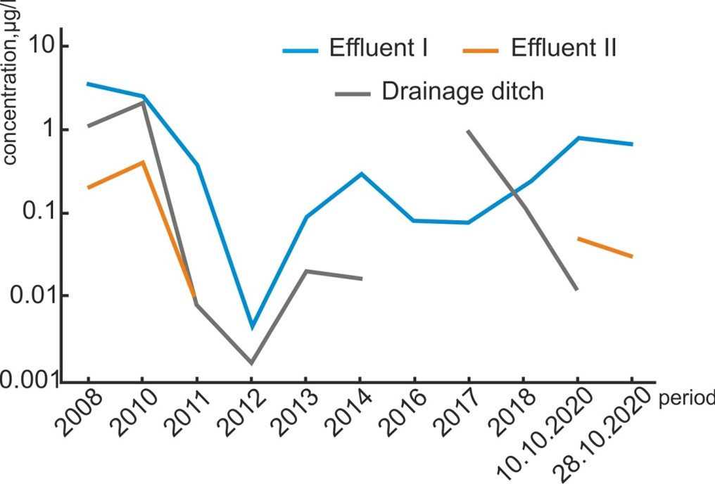 During industrial operations, the sewerage network was pre-treated at the complex treatment facilities and in the neutralization tanks. Despite this, the wastewater before discharging into the Angara River contained high concentrations of different organic and inorganic substances according to (State report, 2011; Alieva and Pastukhov, 2012). In 2000, mercury was defined as the most dangerous toxicant, with concentrations in drainage ditch water of 30-38 µg/l (Rush and Khitskiy, 2003). In 2006 to 2008, mercury concentrations were also very high: up to 9.0 µg/l in effluent I, up to 8.1 µg/l in effluent II and up to 2.5 µg/l in the drainage ditch (Alieva et al., 2011). In 2010, they were 2.39 µg/l in effluent I –, 0.40 µg/l in effluent II, and 1.99 µg/l in the drainage ditch.