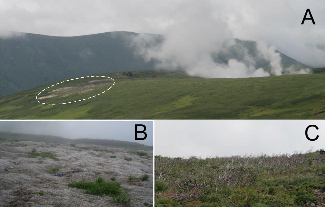 2. Fig.1. Nizhne-Koshelevskoe Novoe thermal field: A – general view (marked by a dotted line); B – grass burnout in the field area; C – bush burnout in the field area.