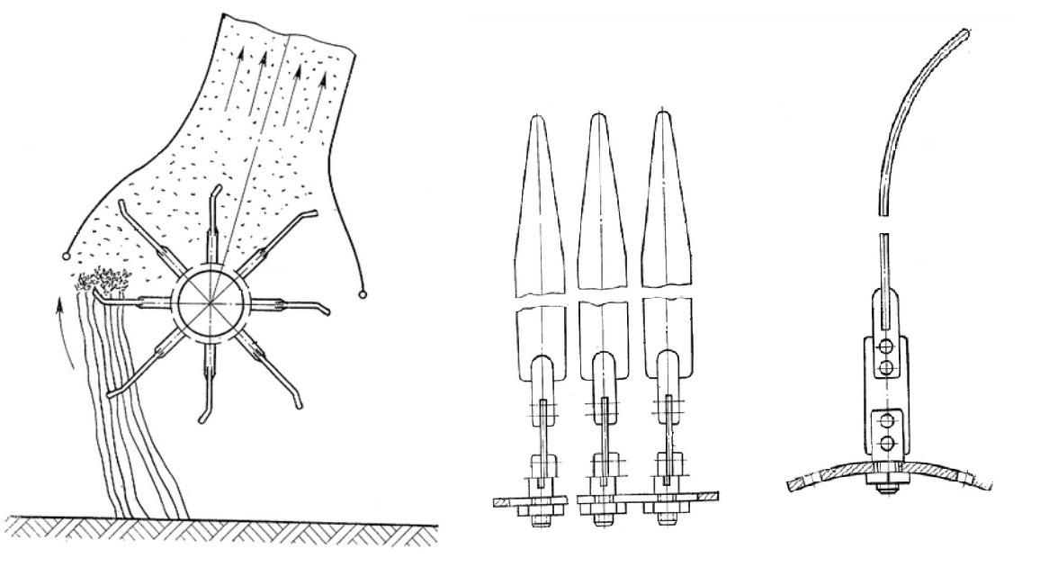 Известен рабочий орган для очесывания верхушек растений [7] (рис. 2). Он содержит барабан, на котором жестко закреплены кронштейны, соединенные с очесывающими пальцами пластинами посредством болтового или заклепочного соединения [8]. Очесывающие пальцы представляют собой пластины с изогнутым профилем.