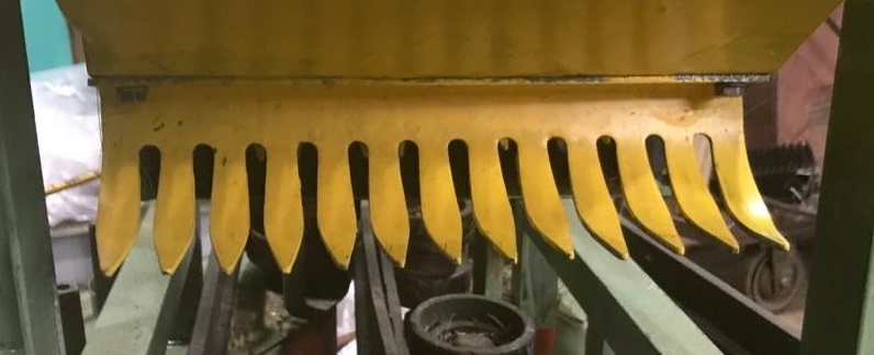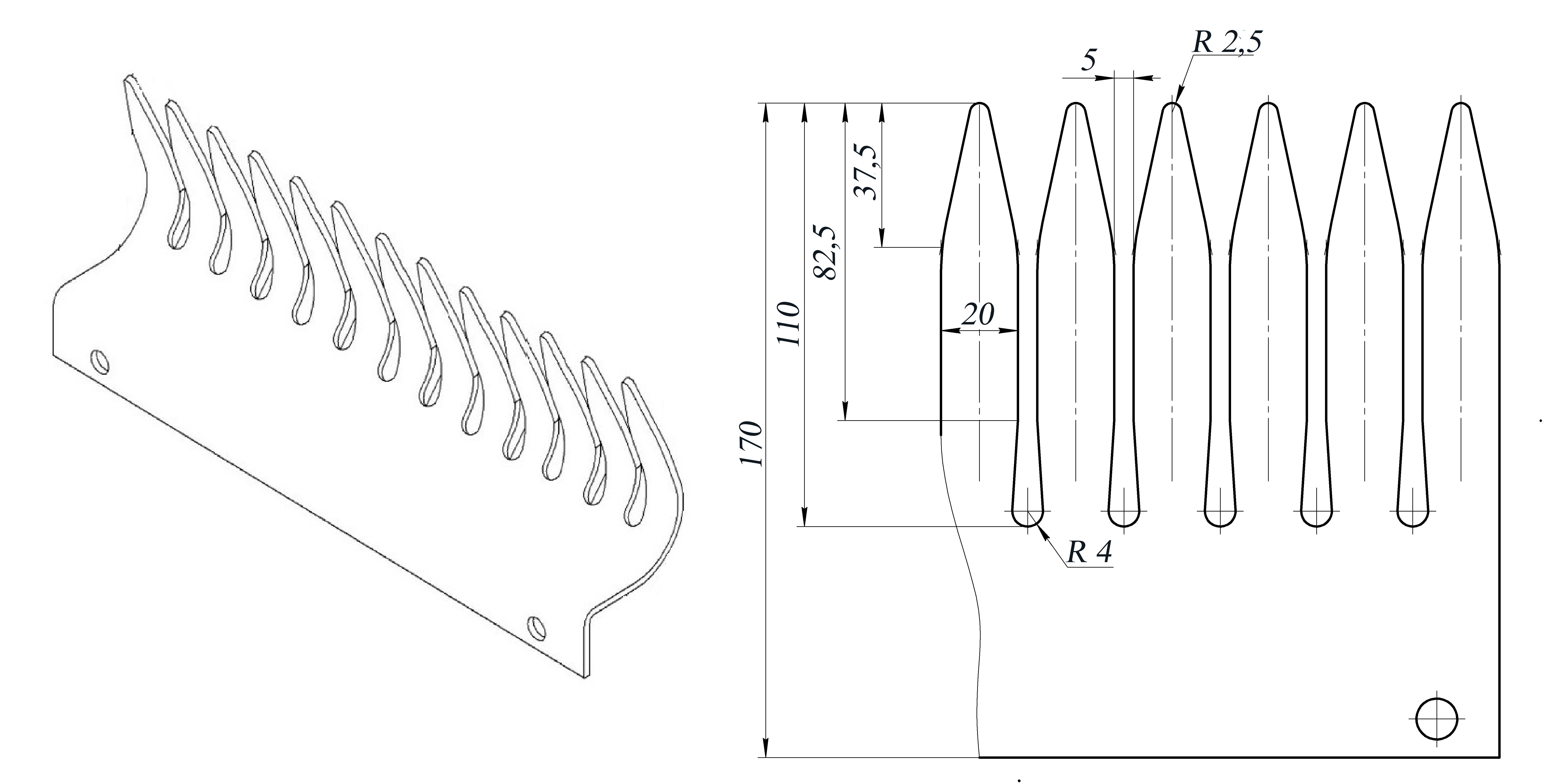 На основании проведенных научных изысканий предложена конструкция съемной гребенки для однороторных жаток барабанного типа [13]. Съемная очесывающая гребенка представляет собой изогнутую под углом 90° пластину, основание которой служит для крепления гребенки к очесывающему барабану. Отогнутая поверхность имеет прорези и зубья, при этом прорези выполнены на расстоянии ¾ от вершины зубьев до линии изгиба пластины. Зубья имеют заострение сверху для входа в растительную массу и формирования слоя, далее переходят в прямой профиль, на котором происходит процесс очеса, и плавное расширение у основания, которое позволяет устранить заклинивание растений между зубьями и обеспечивает уменьшение энергозатрат процесса очеса [2]. В то же время прорезь выполнена не по всей длине боковины гребенки, что позволяет транспортировать семена без потерь. Съемная очесывающая гребенка изображена на рисунке 4.