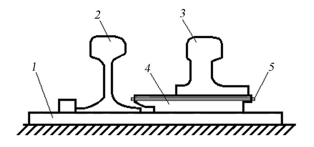 Fig. 1. The scheme of the device of the sliding cushion of the switch shoe with a frame rail and a wit: 1 – lining; 2 – frame rail; 3 – wit; 4 – arrow slip cushion; 5 – inductance coil (induction heater)