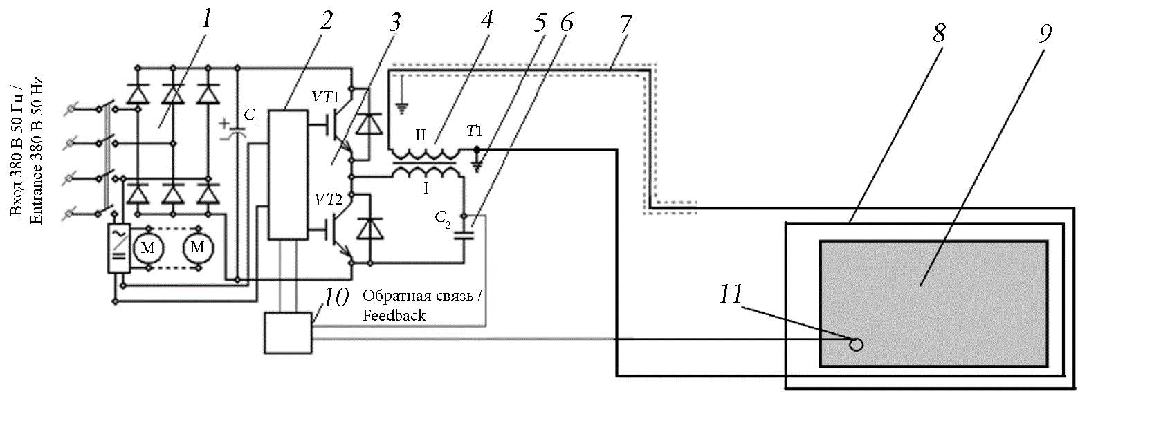 Рис. 2. Электрическая схема прямого точечного индукционного нагрева повышенной частотой подушки скольжения башмака стрелочного перевода: 1 – блок питания; 2 – генератор повышенной частоты; 3 – силовые ключи преобразователя; 4 – резонансный повышающий трансформатор; 5 – заземление; 6 – емкость резонансного повышающего трансформатора; 7 – линия электропередачи; 8 – индукционная катушка; 9 – нагреваемая деталь; 10 – блок управления; 11 – внешний датчик состояния окружающей среды; М – вентиляторы охлаждения