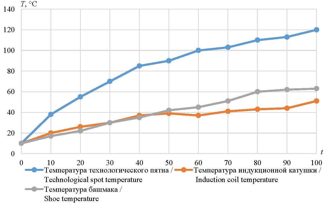 Результаты испытания на нагрев технологического пятна подпятника стрелочного перевода, с замером температуры на технологическом пятне, индукционной катушке, а также температура самого башмака представлены на рисунке 4.