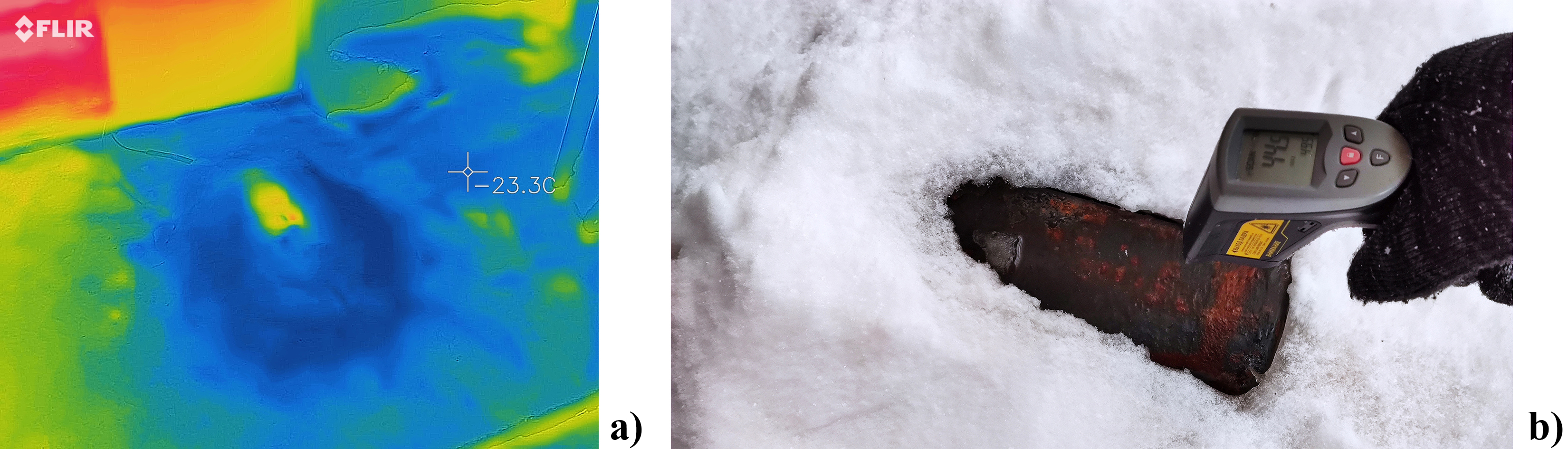 Source: a) the photo was taken using a FLIR thermal imager by L. Yu. Yuferev on the territory of the institute (February 11, 2021); b) the photo was taken by O. A. Roshchin on the territory of the institute on (February 11, 2021).