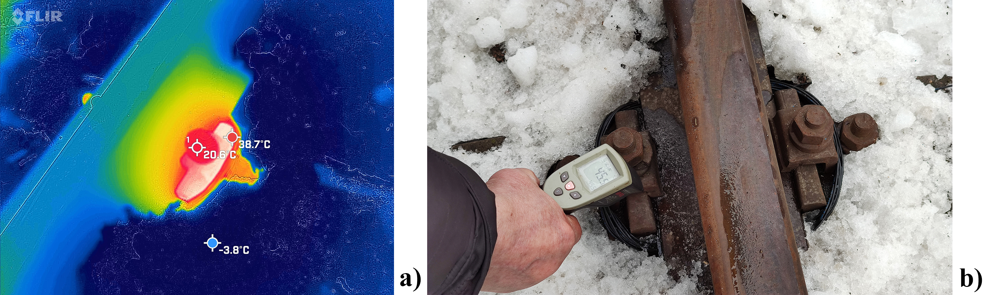 Fig. 8. The experiment of heating the sole of the rail 40 minutes after switching on: a) thermal imaging of the experiment of heating the sole of the rail; b) a snapshot of the rail sole heating experiment