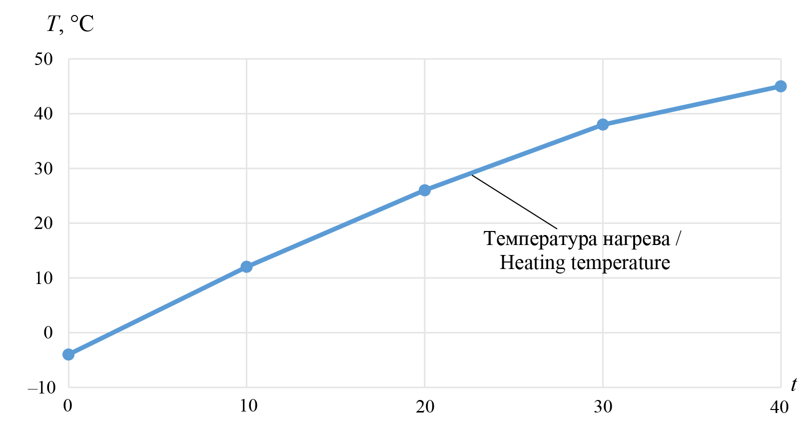 Расчетная и испытанная мощность одного индукционного нагревателя составляет 350 Вт [16]. При такой мощности можно нагреть детали массой 20 кг на 60 °С за 70 мин, при этом снег полностью растаивает. Рабочая частота в 10 кГц повышает уровень электробезопасности [17]: нагрев происходит только в нагреваемой детали, а не в индукторе или подстилке, на которой находится нагреваемая деталь.