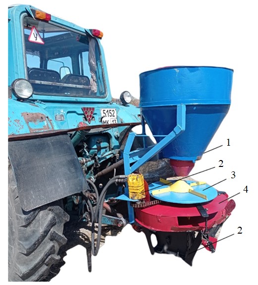 Fig.2. Experimental laboratory-field installation: 1 – bunker; 2 – drive elements; 3 – centrifugal disk; 4 – blade fan