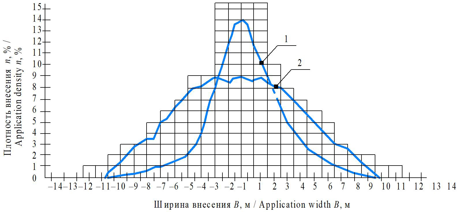 Рис. 4. Характер распределения нитрофоски: 1 – серийный агрегат; 2 – экспериментальный агрегат