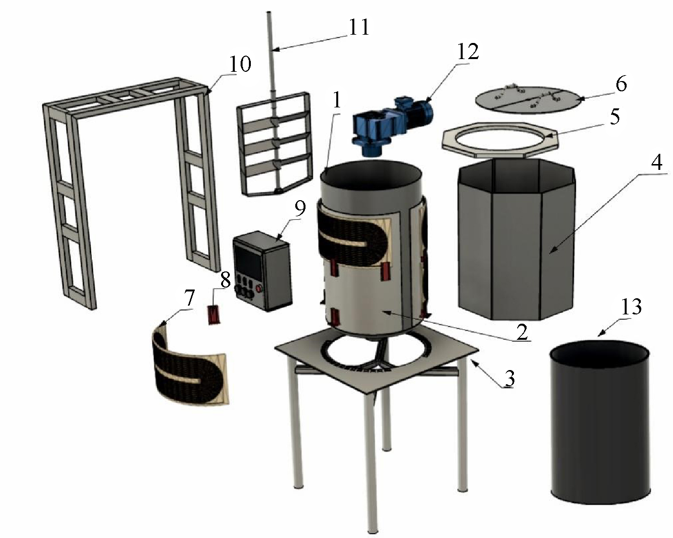 Рис. 1. Схема прототипа пастеризатора: 1 ‒ бак пастеризатора; 2 ‒ ферромагнитные накладки; 3 ‒ стол для размещения пастеризатора; 4 – корпус; 5 ‒ элементы корпуса; 6 ‒ крышка; 7 ‒ индукторы; 8 ‒ крепление индуктора; 9 ‒ блок панели управления; 10 ‒ стойка; 11 ‒ мешалка; 12 ‒ электромотор; 13 – теплоизоляционная рубашка