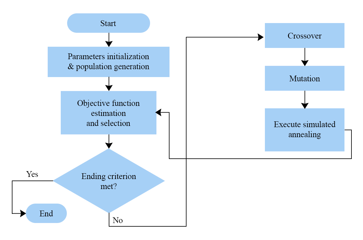Genetic Algorithm-Simulated Annealing (GA-SA). In this work, we have applied the GA and SA in hybrid manner to attain the optimum parameters for the PI controllers gain of VR and CR. In the context of optimization algorithms, the GA-SA framework is employed, where GA represents the global search component and SA denotes the local search component. The GA has the benefits of robust global optimization capability, quick speed, robust versatility, and simple implementation. Nevertheless, a notable limitation of this approach is its suboptimal performance in local search, leading to reduced search efficiency, particularly during the later stages of the optimization process. Conversely, the SA algorithm possesses proficient local search capabilities to compensate for the deficiencies of the GA [16]. The algorithms primarily consist of three key stages: initialization and population generation, iteration, termination and evaluation. Each algorithms share the same population generation [17]. The flow chart of GA-SA is shown in Figure 4.
