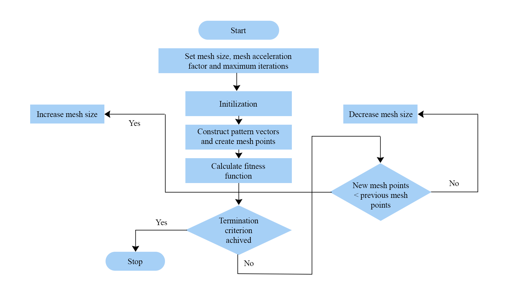 Pattern search optimization techniques. PS algorithm to attain the optimum parameters for the PI controllers gain of VR and CR. The PS optimization technique is a derivative-free evolutionary approach as well as direct search method that is compatible for addressing a diverse range of optimization problems that fall beyond the boundaries of conventional optimization methods. In general, the PS optimization technique possesses the advantage of exhibiting a straightforward conceptual framework, facilitating ease of implementation and computational efficiency. In contrast to other heuristic algorithms, such as the GA, the PS algorithm offers a versatile and well-balanced operator that serves to improve and adjust both global and local search capabilities. The PS method operates by iteratively calculating a series of points that may or may not converge towards the ideal position [18]. The flow chart of PS is shown in Figure 6.