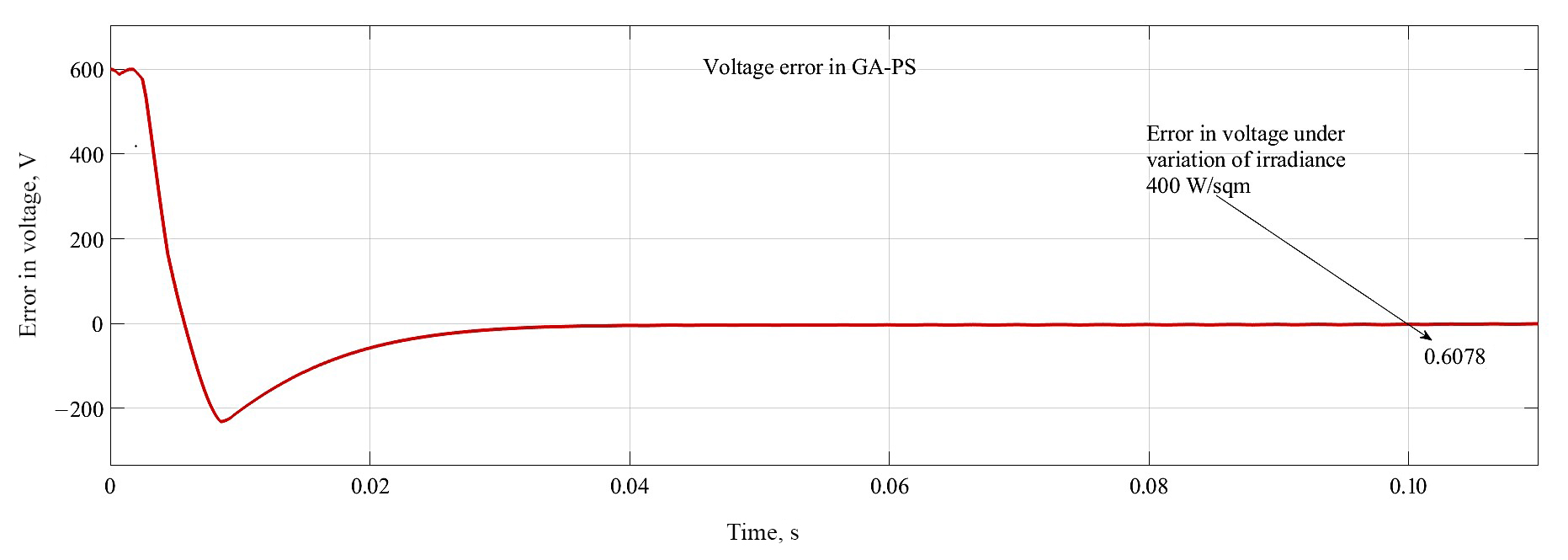 Comparative analysis of minimization of error in DCL voltage under variation of irradiance. As illustrated from Figure 22 the errors reach around under variation of solar insolation from 1 000 W/sqm to 400 W/sqm at t = 0.1 s, for GA-SA optimization techniques the error in DCL voltage at variation of irradiance is 0.6090 V and for GA-PS is 0.6078 V as well when optimized by GA, SA and PS the error in voltage under variation of irradiance is 0.6152, 3.8660 and 1.6430 respectively. Clearly shows that when technique is hybridized the error in voltage is less under variation of irradiance.