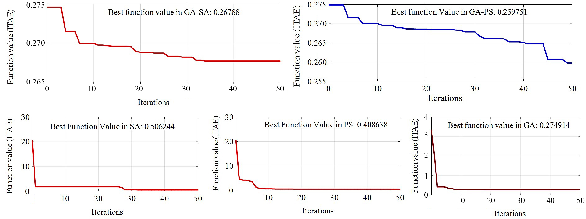 Behavior of various optimization techniques with number of iterations. Figure shows the convergence behavior of the suggested GA-SA and GA-PS in solving the minimization of error in voltage and current regulator for obtaining optimal PI parameters. It can be observed that the ITAE exhibited a decrease as the number of iterations increased. In addition, the ITAE serves as the fitness function, therefore minimizing ITAE leads to progress towards the optimal vicinity.