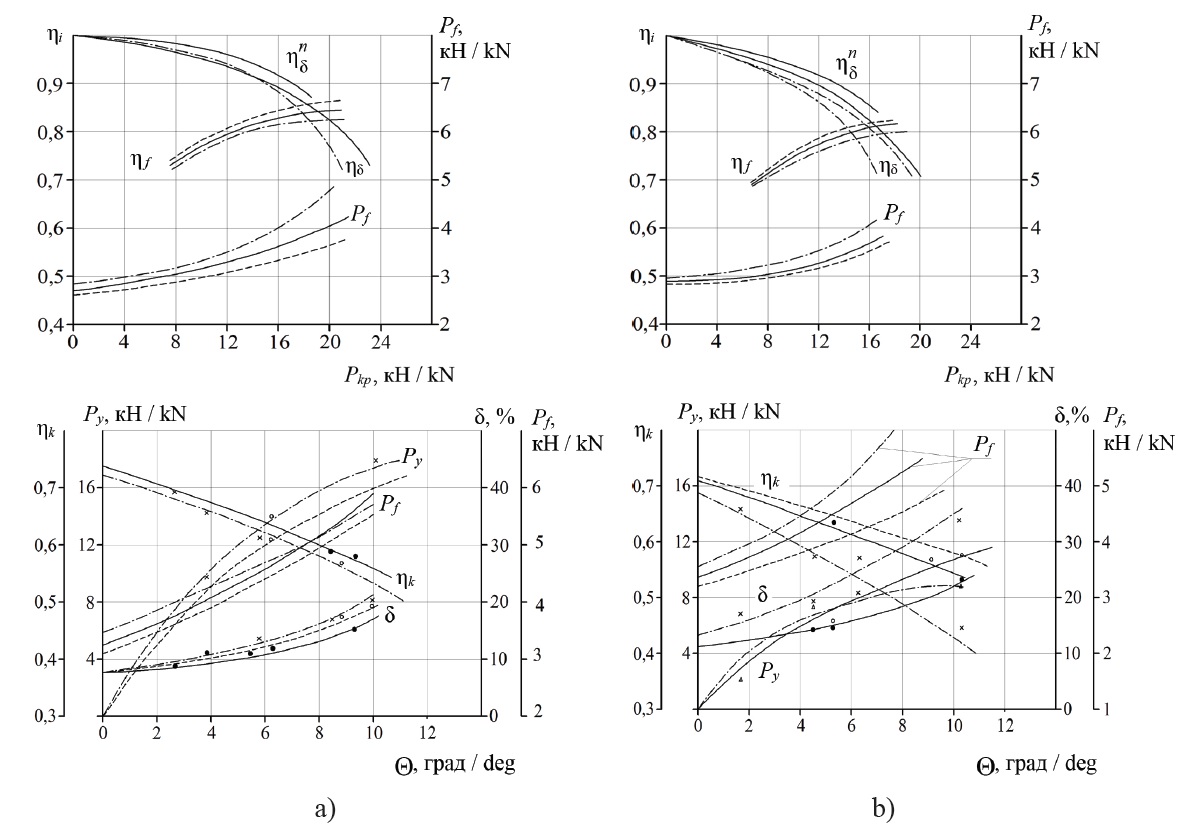 Данные испытаний шины 30,5R-32 [10; 38] на модуле «шинный тестер» [39] однозначно показывают смещение графиков, отображающих функции ηm(Pm ), с ростом угла ее бокового увода в сторону снижения тягового КПД и усилия тяги, в то время как графики функций δ(Pm ) смещаются в сторону возрастания значений буксования.