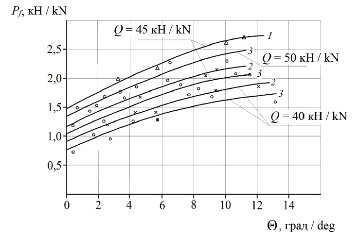 Полученные для шины 30,5R-32 по зависимости (17) силы Pf от угла бокового увода в ведущем режиме колеса показаны на рисунке 3.