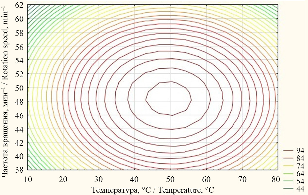 На рисунке 2 показано двумерное сечение поверхности отклика, характеризующее зависимость времени распада гранул корма от температуры и влажности сырья. Из графика на рисунке 2 видно, что влажность сырья существенно влияет на водостойкость гранул, в то время как влияние температуры сырья менее существенно. График показывает, что повышение влажности сырья до 42 % и его температуры до 56 °С приводит к увеличению времени распада гранул в воде. Наилучший результат, при котором время распада гранул составляет 92 мин, достигается при влажности сырья 38–42 % и температуре 41–56 °С. При увеличении значений факторов выше этого диапазона происходит снижение времени распада гранул.