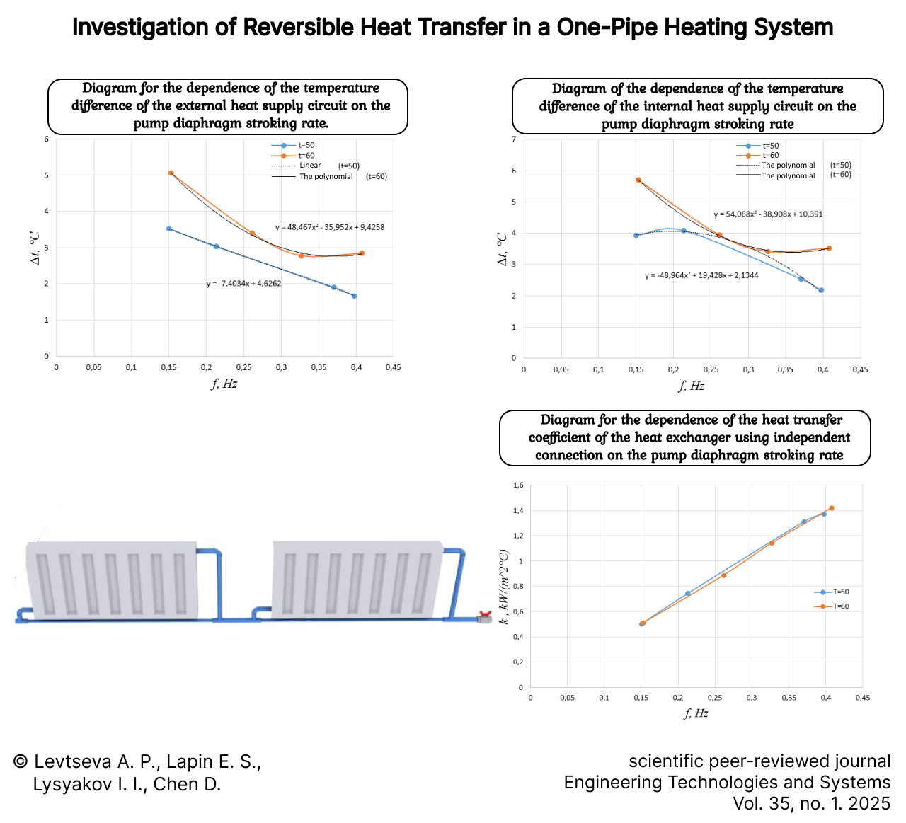 В связи с этим целью данной работы стало исследование условий создания реверсивного движения теплоносителя в системе отопления с независимым подключением, а также получение экспериментальных зависимостей перепада температур для греющего (внешнего) и нагреваемого (внутреннего) контура теплоснабжения и коэффициента теплопередачи для промежуточного теплообменника от частоты хода диафрагмы мембранного насоса. Последние позволяют выбрать рациональный режим реверсивной передачи тепловой энергии в однотрубных системах отопления с независимым подключением.