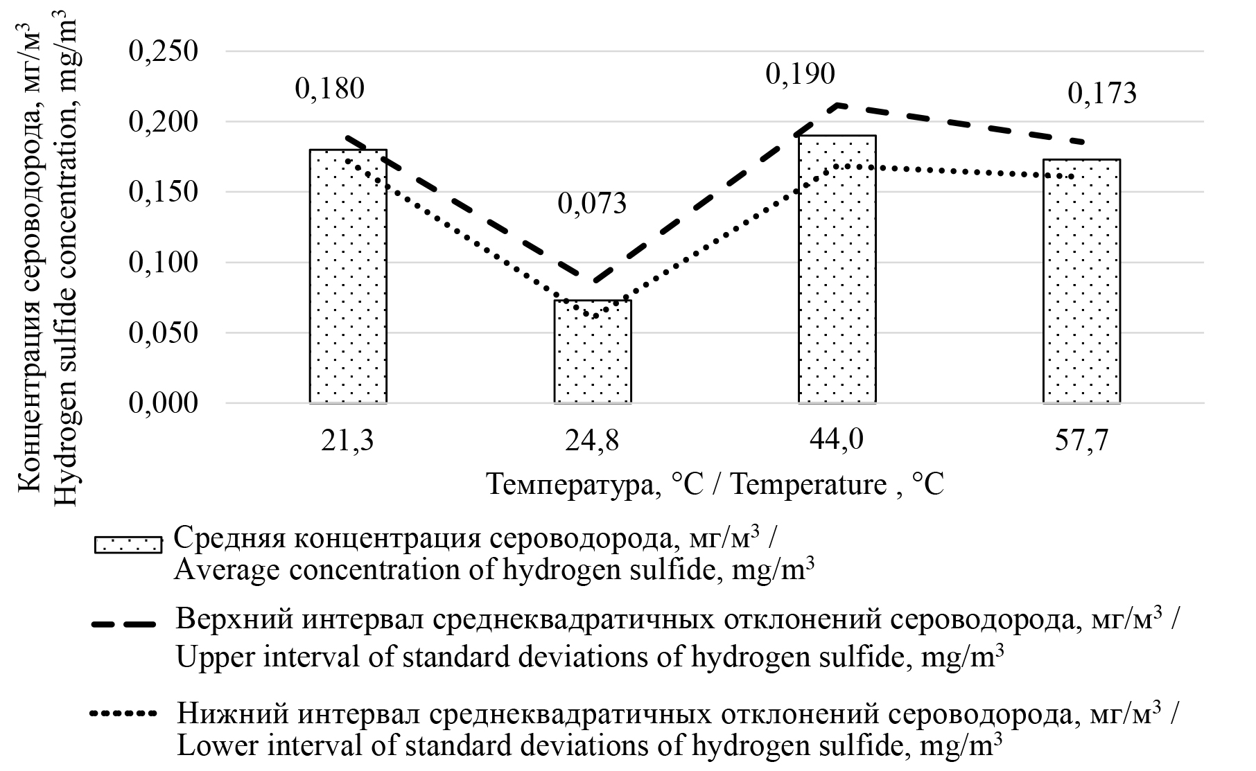 Рис. 6. Значения средней концентрации сероводорода, верхний и нижний интервалы среднеквадратических отклонений сероводорода