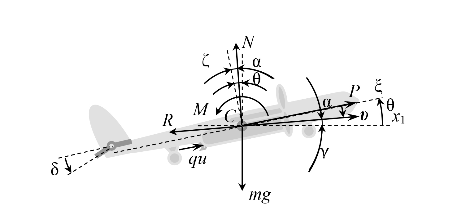 Примечание: θ – угол тангажа, образуемый осями Cξ и Cx1, рад; γ – траекторный угол, образуемый вектором скорости υ и осью Cx1 (γ = θ − α), рад; m – масса малого беспилотного летательного аппарата, кг; q ‒ расход рабочего вещества при обработке поля на единицу длины пути вдоль оси Ox, кг/м; P ‒ величина главного вектора сил тяги двух пропеллеров (сила тяги), Н; N ‒ величина главного вектора подъемных сил (подъемная сила), Н; R ‒ величина главного вектора сил сопротивления (сила сопротивления), Н; M ‒ величина главного момента внешних силы относительно оси Cη, Н м; g ‒ ускорение свободного падения материальной точки, м/с2.