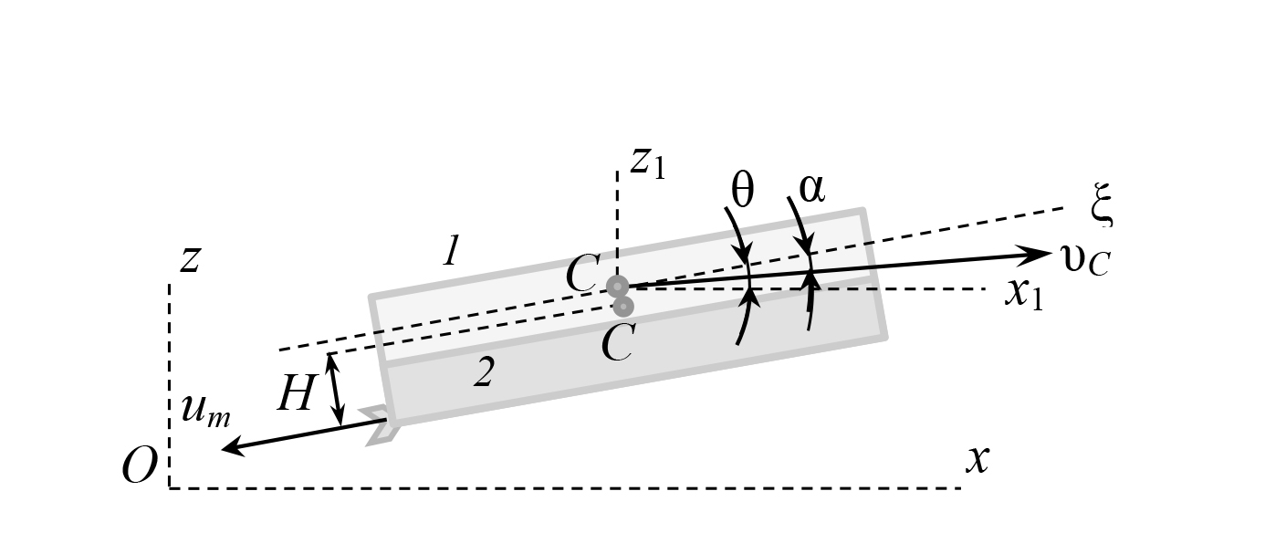 Примечание: Oxyz – неподвижная ортогональная система декартовых координат с началом O на уровне моря, горизонтальными осями Ox, Oy и вертикальной осью Oz, направленной вверх; Cξηζ – связанная с малым беспилотным летательным аппаратом ортогональная система декартовых координат с началом C в центре масс малого беспилотного летательного аппарата, осью Cξ, совпадающей с главной продольной осью инерции малого беспилотного летательного аппарата, перпендикулярной ей осью Cζ в плоскости симметрии малого беспилотного летательного апарата и перпендикулярной обеим этим осям осью Cη; Cx1 – подвижная горизонтальная ось, параллельная оси Ox; x, z – координаты центра масс малого беспилотного летательного аппарата (точки C) в неподвижной системе координат по осям Ox, Oz, м; β – угол наклона средней прямой линии профиля поля в продольной вертикальной плоскости, рад; υ ‒ величина скорости центра масс малого беспилотного летательного аппарата, м/с; α – угол атаки, образуемый продольной осью Cξ и вектором υ или проекцией вектора υ на плоскость симметрии малого беспилотного летательного аппарата, рад; h – высота полета над полем, м; δ – угол поворота руля высоты с отсчетом от нулевого положения, рад; u ‒ величина скорости частиц вещества, распыляемого при обработке поля, относительно корпуса малого беспилотного летательного аппарата в направлении, противоположном направлению продольной оси Cξ (u > 0), м/с;