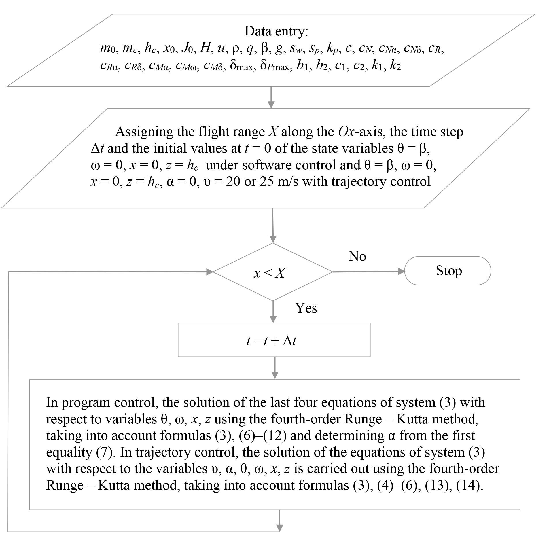 Вопрос обоснования коэффициентов b1, b2, c1, c2, k1, k2 не рассматривался. Коэффициенты оценивались так, чтобы значения переменных управления не превышали заданных рабочих пределов δmax по углу поворота руля высоты и δPmax по перемещению дроссельной заслонки (тяги двигателя). Технология подобной оценки приведена, например, в упомянутой выше работе Р. У. Биарда и Т. У. Маклэйна5. В равенствах (13), (14) предполагается, что значения высоты полета, угла тангажа, угловой скорости и скорости, регистрируемые датчиками и рассчитываемые по уравнениям движения МБЛА, совпадают. Шесть уравнений (3) после подстановки в них выражений (13), (14) для переменных управления содержат все шесть переменных состояния и при заданных начальных значениях переменных и коэффициентах могут быть решены. Уравнения (3) с учетом уравнений (4)–(7), (13), (14) рассматриваются как модель траекторного управления.