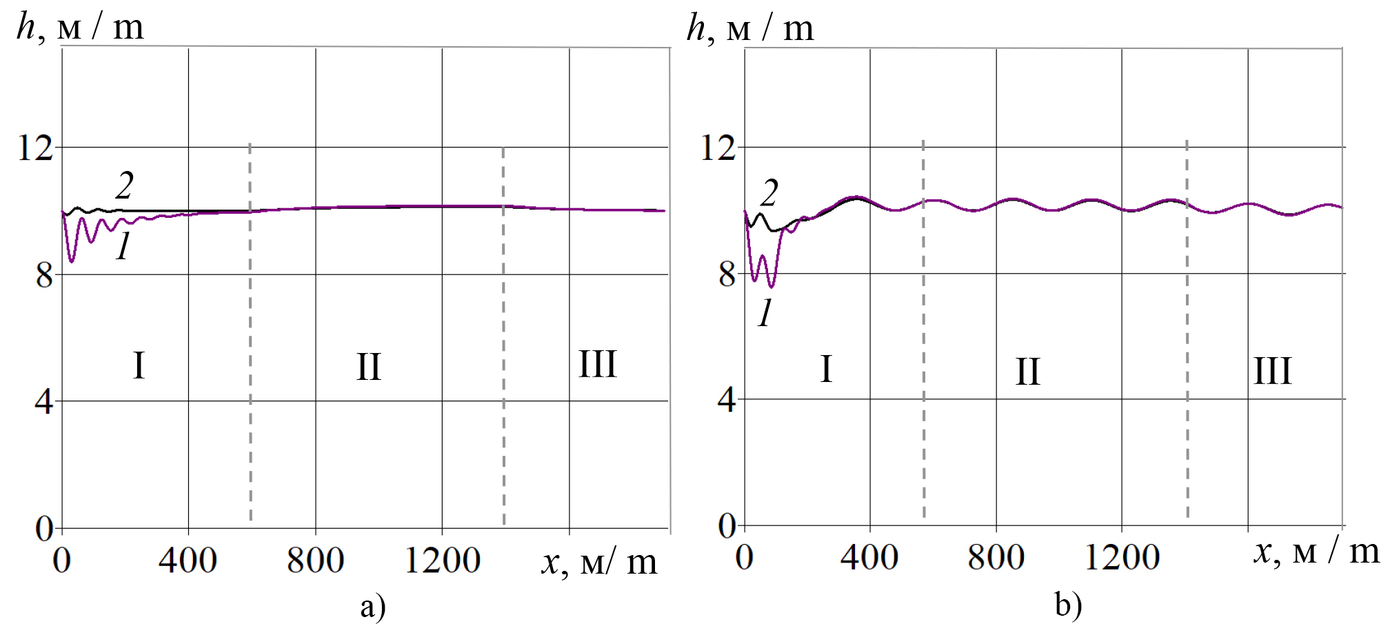 F i g. 6. Dependence of the flight altitude h above a field with a straight inclined profile (a) and a wavy inclined profile (b) on the coordinate x with trajectory control and a given speed: