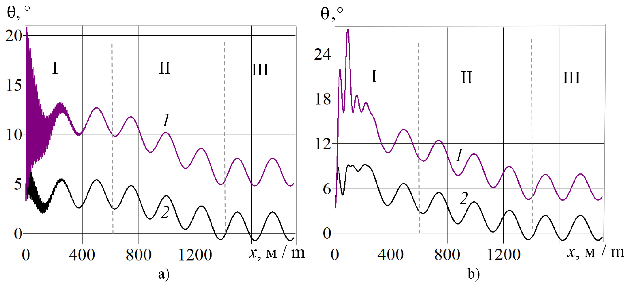 F i g. 8. Dependences of the pitch angle θ on the displacement x of the center of mass of the small unmanned aerial vehicle with program control (a) and trajectory control (b) of flight over a field with a wavy inclined profile at a speed: