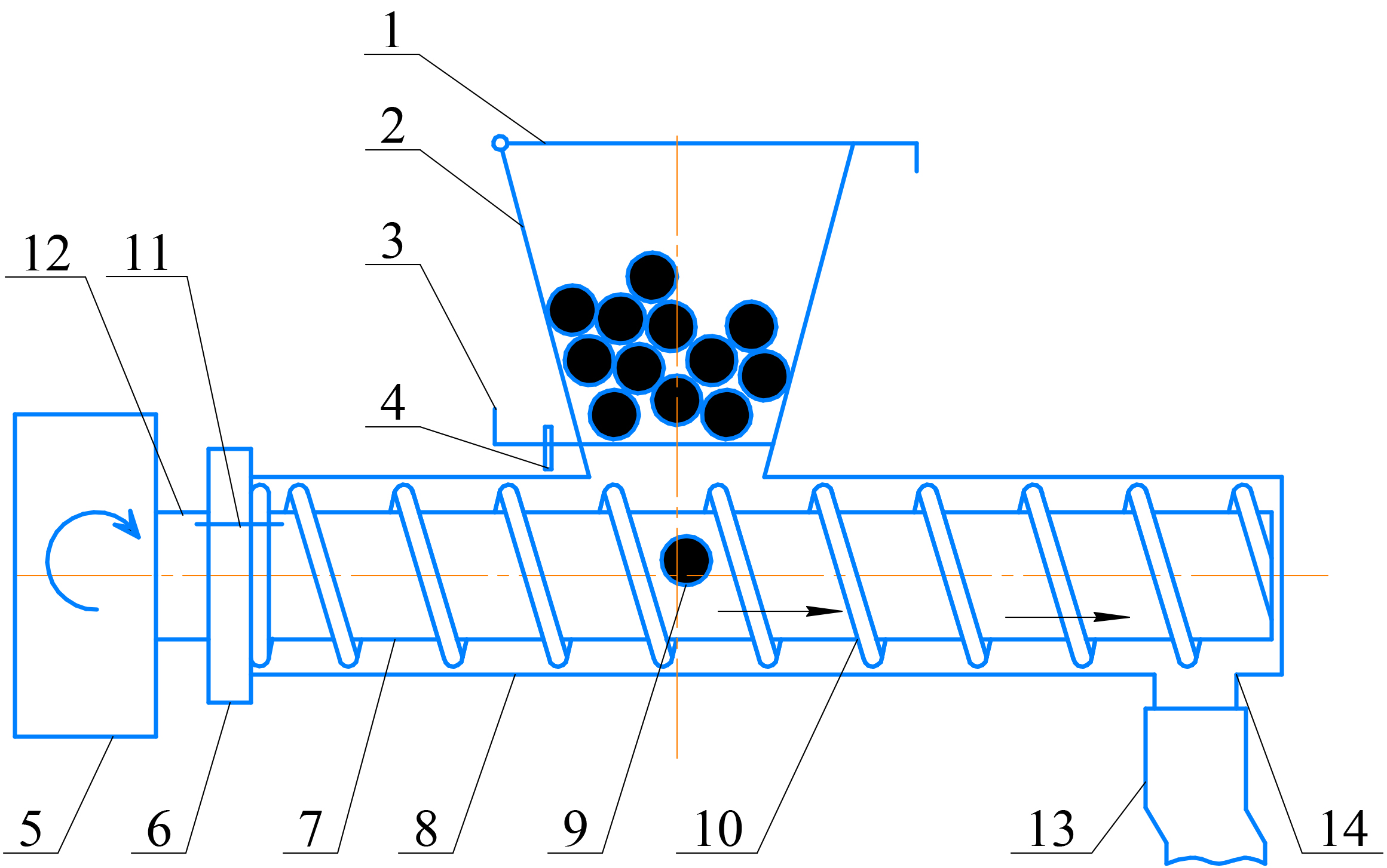 Fig. 3. Spiral-screw seed-sowing device: 1 ‒ lid; 2 ‒ loading hopper; 3 ‒ dispenser; 4 ‒ retainer; 5 ‒ drive device; 6 ‒ disc; 7 ‒ inner tube; 8 ‒ case; 9 ‒ seed material; 10 ‒ working body; 11 ‒ bolted connection; 12 ‒ shaft; 13 ‒ flexible tube; 14 ‒ exit window