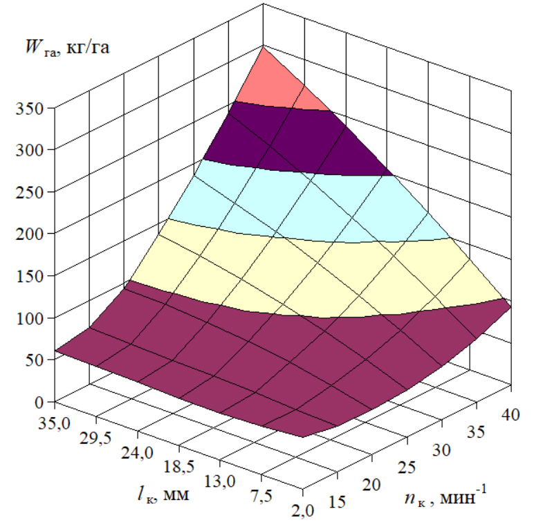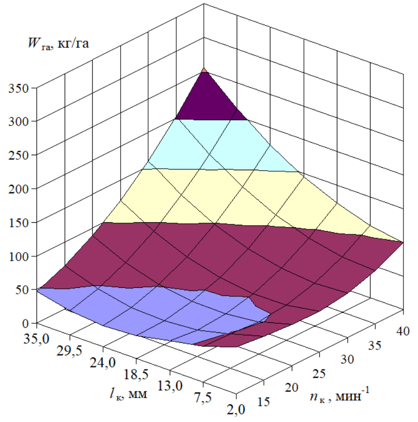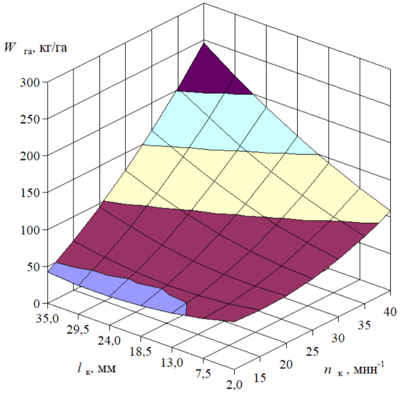 Fig. 11. Model of the dependence of the rates of seeding vetch by the roller feed unit on the rotation frequency and the roller operating length