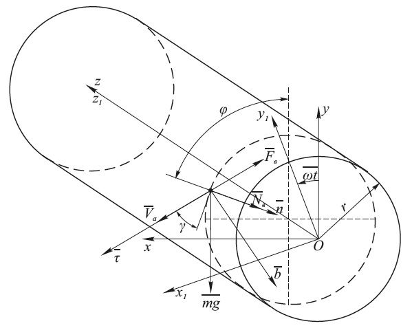 Введем подвижную систему координат Ox1y1z121 (рис. 2) [17], в которой и рассмотрим перемещение частиц. Эта подвижная система завязана с поверхностью рифа бича и движется вместе с ним по окружности с векторной величиной скорости ω относительно оси вращения Oz. Далее принимаем упрощение, что риф бича является элементом винтовой поверхности и переносим движение частицы в подвижной системе Ox1y1z1 в естественные оси .