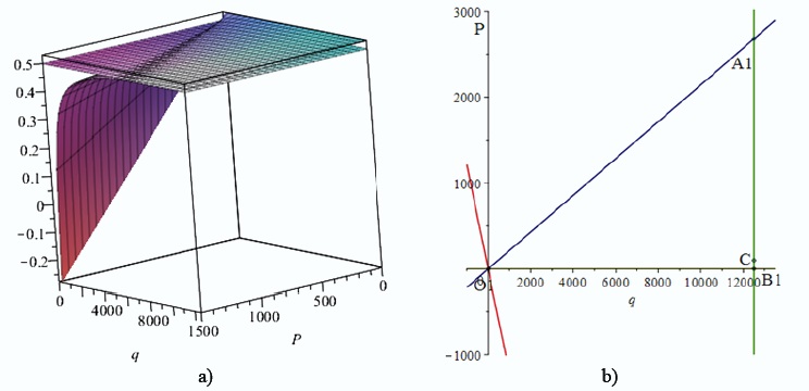 Численное решение указанной системы неравенств методом перебора с использованием пакета математических программ Maple позволило определить значение параметров Р-q, при котором отклонение точки экстремума на эпюре изгибающих моментов от точки С (рис. 4) будет иметь место. Это позволит определить наиболее невыгодное положение существующей системы расчета вала на прочность, дав максимальное различие с результатами, полученными с использованием предложенной методики. Найденная область изменения параметров внешнего воздействия О1А1В1 изображена на рисунке 6 b. Красная прямая определяет здесь полуплоскость, задаваемую неравенством xmax > 0,5, синяя – полуплоскость xmax < 0,7. Точкой C обозначено напряженное состояние, рассматриваемое на рисунках 3–5. Она принадлежит треугольнику О1А1В1, что и позволяет говорить в рассматриваемом случае о необходимости проведения скорректированного расчета.