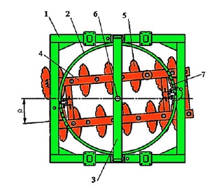 It is a hinged connection of two sections: a fixed (green) and a movable turning (red). The fixed section is made in the form of a welded square frame 1 with a guide ring 2 and a middle beam 3. The movable rotary section is made in the form of a rectangular frame 4, on the side beams of which racks with cutting discs 5 are rigidly fixed in a staggered manner 5. Initially, the working discs 5 are installed perpendicular to the beams of the movable frame 4. When the beam frame rotats, the approach angle changes α = 15; 30; 45°. The inclination angle of the discs to the soil (the angle of obstruction) was 70°.