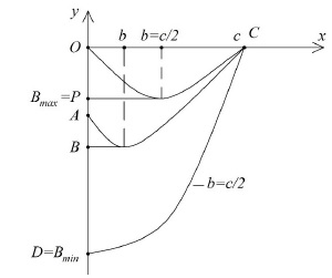 Как следует из (рис. 3), при любых значениях x параметры а в линии проходят через точку С (х = с, у = 0). Вершина параболы получена при х = b и у(b) = B = –a(c – b)2. При пересечении с осью вращения при x = 0, y(0) = A = ac(2b – c), получаем: