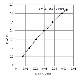 Как видно из данного графика, зависимость приближается к линейной с уравнением прямой линии y = 3,3866x ‒ 0,126 и согласуется с экспериментальной зависимостью в пределах 4 % [10; 11].