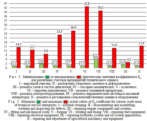 Fig. 3. Minimum and maximum actual values of Kп coefficient for various work areas