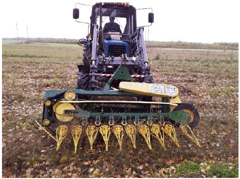 Эксперименты проводили в Федеральном научном центре лубяных культур (г. Тверь). Было изготовлено три льнотеребильных аппарата с поперечными ленточно-дисковыми ручьями: ТЛН-1,9П, ТЛН-1,9М (рис. 2, 3) и ТЛН-1,9К (рис. 4). Их агрегатировали с мобильным энергосредством (трактор Т-25А1). Скорость агрегата в опытах была 1,6–3,0 м/с. Рисунок 2 был использован в одной из предыдущих работ М. М. Ковалева8.