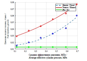 Экспериментальный образец дизеля воздушного охлаждения 2Ч 10,5/12,0 был переоборудован для работы на этиловом спирте и рапсовом масле (РМ) с использованием раздельных систем топливоподачи. Дизель оснащен полусферической камерой сгорания в поршне. Этанол использовался в качестве основного топлива и воспламенялся от поступающей в КС дизеля струи РМ. Этиловый спирт имеет меньшую теплотворную способность, по сравнению с дизельным топливом, следовательно, возникла потребность корректировать цикловую подачу топлива в сторону увеличения (табл.).