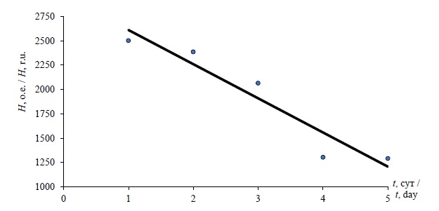 Интегральная поглощательная способность молока во всем диапазоне 200–500 нм не является информативной, поскольку количественные изменения происходят в диапазонах 220–340 нм, а также 350–500 нм. Зависимость интегральной поглощательной способности Η в диапазоне 220–340 нм от времени скисания представлена на рисунке 2.