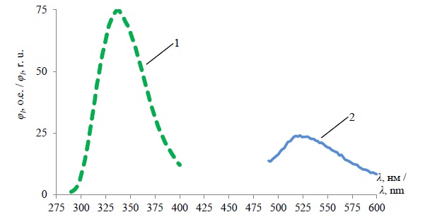 Измерения спектров возбуждения и люминесценции проводили на спектрофлуориметре «Флюорат-02-Панорама» (производство фирмы «Люмэкс», Россия) с программным обеспечением PanoramaPro. Производили измерения спектральных характеристик возбуждения (поглощения) ηe(λ) в диапазоне 200–500 нм по методике, описанной в другой работе [28]. Повторность измерений десятикратная. Для измерения спектра люминесценции φl(λ) монохроматор возбуждения устанавливали на ту же длину волны, на которой наблюдается максимум спектра возбуждения при синхронном сканировании. Монохроматор регистрации люминесценции сканирует более длинноволновую область. Все спектры были скорректированы на инструментальные искажения возбуждения с помощью программных средств PanoramaPro. По полученным спектральным характеристикам определяли интегральную поглощательную способность Η по формуле: