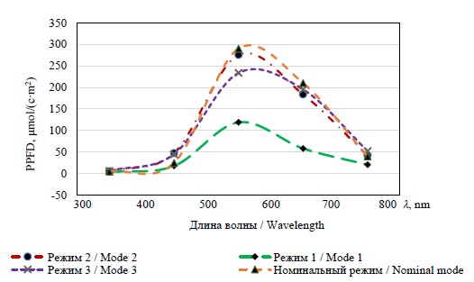 Графики демонстрируют существенное влияние Uоб и Тв на количественное распределение энергии по отдельным спектральным линиям и, как следствие, на технологию процесса выращивания, учитывая роль каждого спектрального диапазона по отдельности в эффективности процессов, определяющих физиологию и продуктивность растений. Так, в режиме 1 значение PPFD снижается во всем исследуемом диапазоне длин волн по сравнению с номинальным режимом: Δλ = 300–400 нм на 1,44 мкмоль/(м2·с); Δλ = 400–500 нм на 7,3 мкмоль/(м2·с);