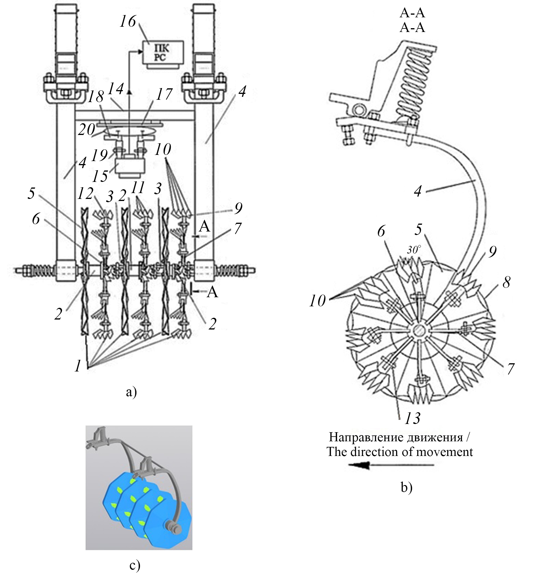 1 – диски; 2 – батарея; 3 – шарниры; 4 – стойка; 5 – рифленые диски; 6 – игольчатые диски; 7 – игла; 8 – окружность; 9 – лопатки зубчатые; 10 – вершина; 11 – впадина; 12 – скребок; 13, 19 – стопорные болты; 14 – рама; 15 – мультимедийное устройство; 16 – персональный компьютер; 17 – каретки; 18 – телескопические стойки; 20 – механизм поворотный;