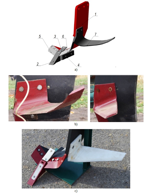 2 – chisel; 3 – clod crusher; 4 – thrust plate; 5, 6 – share blades; 7 – hoe); b) curved and flat hoes; c) polymer