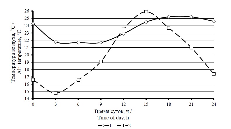 1 – средняя температура воздуха в коровнике в течение суток, °С;