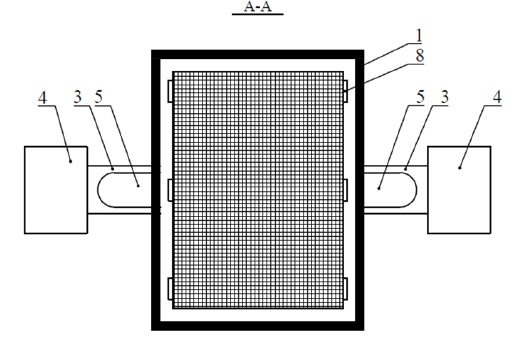 Сублимационная установка содержит камеру сушки, СВЧ-камеру (рис. 3, 4), сообщающуюся с волноводом 2, форма которого идентична периметру СВЧ-камеры 1, а через встречные перпендикуляры, направленные волноводами 3, она соединена с однотипными СВЧ-генераторами 4 с одинаковым электромагнитным полем (частотой, амплитудой и мощностью). В центре боковых сторон СВЧ-камеры 1 установлены вакуум-отводы 5, а внутри ее размещается тележка 6 с направляющими фиксаторами 7 и стойками 8 с закрепленными уголками 9, на них установлены лотки 10, дно которых изготовлено из диэлектрической сетки 11, диагональ отверстия сетки меньше размера высушиваемых частиц.
