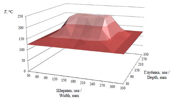 На рисунке 2 показано минимальное распределение температурного поля при потреблении 400 Вт, отклонение от заданного интервала ±5 °С на площади 200 см².
